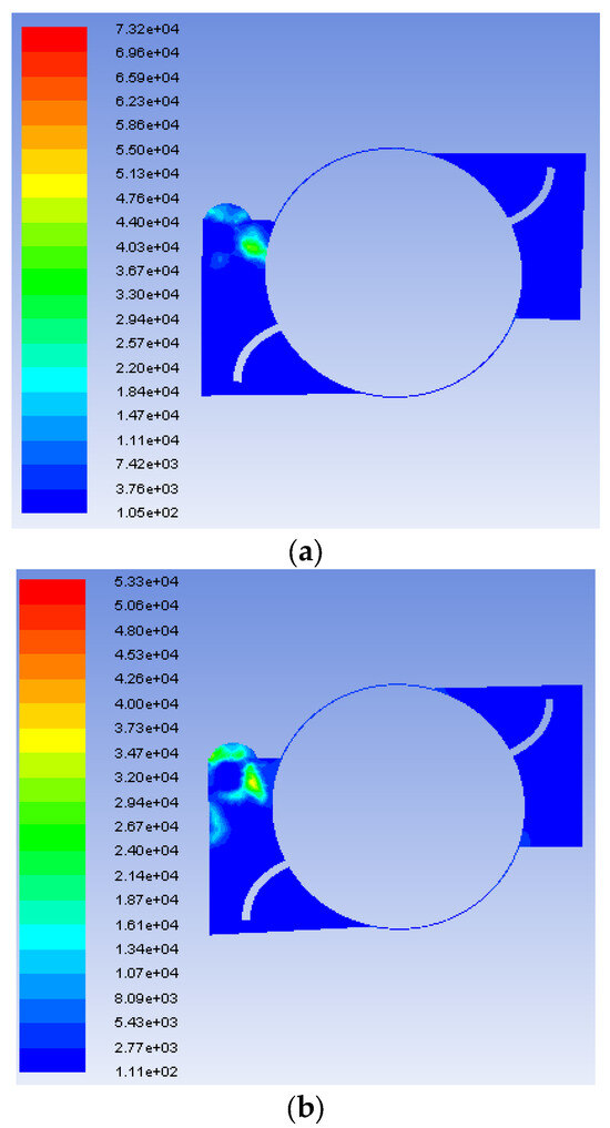 Oil phase cloud image of oil particle size distribution in the cavity with different layers of rolling body. (a) Turbulence intensity distribution diagram of rolling body in 6 layers at axial section (z = 0), (b) Turbulence intensity distribution diagram of rolling body in 10 layers at axial section (z = 0).