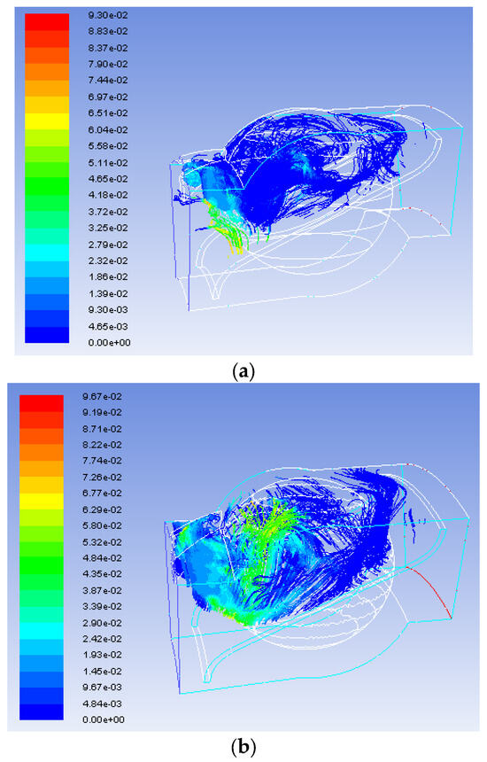 It can be seen from Figure 4 that when the rolling elements are divided into six layers in Figure 4a, the oil in the bearing cavity is affected by its stratification, and the particle size distribution of the oil in the cavity changes significantly. The large particle size oil diffuses, and the oil near the small end face decreases. Although it is affected by the airflow, the large-size oil is still distributed near the rolling elements. As shown in Figure 4b, dividing the rolling element into 10 layers still results in influence from the vortex generated by the airflow. However, the large-diameter oil gradually diffuses between the outer ring raceway and the rolling elements. Increased stratification significantly alters turbulence intensity, enhancing oil diffusion within the bearing cavity. However, during this diffusion process, larger oil droplets experience minimal change, indicating that the varying stratification of the rolling elements affects the distribution of oil atomization in the bearing cavity.