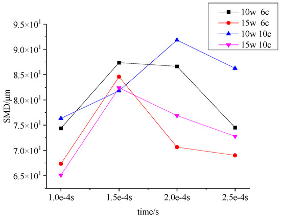 Figure 6 presents a distribution diagram of the SMD of the mist field oil in the case of different rotation speeds and different stratifications with time changes of the rolling elements in the cavity. As shown in the figure, when the rolling body is in different layers, the oil particle size at the surface is initially small, and the volume of oil entering the bearing cavity through the groove is limited. Consequently, the proportion of large oil particles is also low, resulting in a reduced amount of oil reaching the rolling body and a small Sauter Mean Diameter (SMD) of the oil particles at the outset. With the change of time, the oil in the bearing cavity gradually increases, the SMD of the oil particles is higher, the atomization quality is poor, and the lubrication effect is better. As time increases and rotation speed rises, strong airflow and the rolling body contribute to a decrease in the size of large oil particles, leading to enhanced atomization. Consequently, the Sauter Mean Diameter (SMD) gradually decreases, improving atomization quality but adversely affecting bearing lubrication. However, when the rolling elements are divided into 10 layers, the more stratified arrangement results in a smaller vortex around them, leading to a reduced influence on the oil in the cavity. Therefore, when the rolling elements are divided into 10 layers, the impact on bearing lubrication is relatively small, which is beneficial to the lubrication of the bearing.