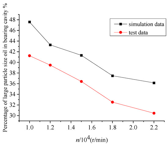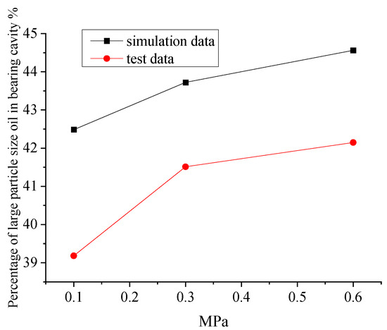 Figure 15 shows the size change of large-particle oil in the bearing cavity under test conditions when the bearing speed is 2.2 × 104 r/min. It can be seen from the figure that under the same injection pressure, the proportion of large-particle oil in the bearing cavity obtained from the simulated data is slightly higher than that from the experimental data. With the increase in injection pressure, the proportion of large-particle oil in the rolling bearing chamber increases non-linearly; however, with the continuous increase in injection pressure, the proportion of large-particle oil in the bearing chamber increases slightly. However, the value of the simulated data is slightly higher than that of the experimental data. The reasons are the same as above, so it will not be described too much.