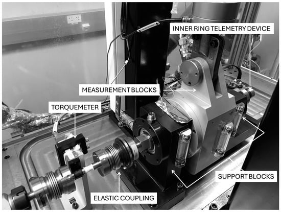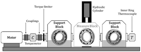 Niel et al. [] developed a test bench for studying both the power losses and the thermal behaviour of rolling element bearings under different operating conditions. A scheme of the test bench is given in Figure 1 and a photo of the measurement region is given in Figure 2. A more detailed presentation is available in references [,], but the test apparatus and the measurement protocol are briefly introduced here.