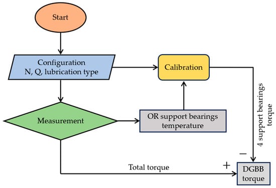 The test bench comprises a motor rotating a shaft equipped with a torque meter positioned between two bellows couplings. The signal is measured with strain gauges, and the information is transmitted by induction. The torque meter is followed by two support blocks (in black in Figure 2) surrounding the measuring block containing the REB to be studied. Identical bearings in the two support blocks are lubricated by an oil bath with the same oil level. As they generate resistive torque, one must be able to estimate it whatever the operating condition. A specific calibration campaign was therefore conducted, including three radial loads (1, 3, and 5 kN) at rotational speeds from 3200 rpm to 9700 rpm, during which the outer ring temperature of each bearing in the blocks and the total power were measured. This allowed the formulation of the four-support block torques based on both the load and the rotational speed to be proposed. During the experiment, once the tested bearing has been placed in the measurement block and the rotational speed and the load specified, (i) the torque meter measures the total torque on the shaft line, (ii) the torque generated by the bearings located in the two blocks is evaluated using the calibration formulation, and (iii) the torque generated by the tested bearing is estimated from the subtraction of the two previous torque values. A flowchart illustrates this procedure in Figure 3. A radial load can be applied to the measurement block using a hydraulic cylinder. No axial load was applied in this study. Labyrinth seals or lip seals can be installed in the blocks, with the latter mainly used in oil bath lubrication tests where the oil level is significant.