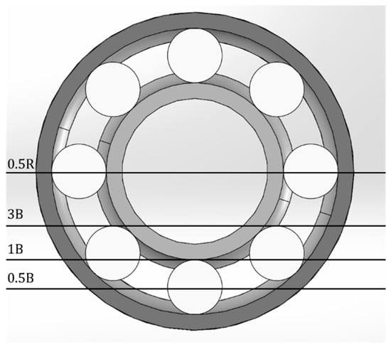 Test campaigns were conducted on two bearing references (6311 and 6208) to study the losses of DGBBs lubricated through oil bath lubrication. For each tested bearing, four oil levels were applied. The oil level was defined in relation to the number of immersed balls under non-rotating conditions. To achieve this, it was decided that the static bearing be placed in such a position that a single ball was at its lowest point (Figure 4). This position is in accordance with the recommendation given by bearing manufacturers when they suggest the oil level (i.e., half the diameter of the lowest rolling element). The lowest level corresponds to a half-immersed ball (0.5 B), and then increases with one fully immersed ball (1 B), three immersed balls (3 B), and half of the immersed DGBB (0.5 R) (Figure 4).