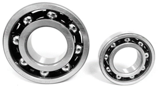 The two DGBBs depicted in Figure 5, with references 6311 and 6208, were tested. The dimensions of the tested bearings are provided in Table 2. The internal geometry was known for both tested bearings. Some information provided by the manufacturers is given in their catalogues such as the outer diameter , the inner diameter , the mean diameter (equal to ), the width , and the static load rating . Additional information about the internal geometry, given by the bearing manufacturer, is provided in Table 2 such as the ball diameter and the number of balls . The relative space between the balls is given as .