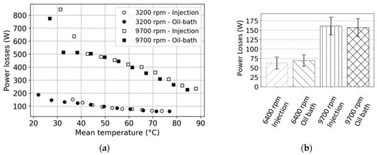 Comparison of bearing losses between injection and oil bath lubrication with half-submerged ball ((a) 6311 DGBB at several mean temperatures; (b) 6208 DGBB at 50 °C).