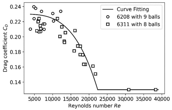 The drag coefficient must be estimated for bearing applications. A numerical model integrating three rolling elements with periodicity conditions and the different relative movements was developed, considering the displacement and rotation of the balls in the fluid []. This coefficient was determined numerically using the CFD (Computational Fluid Dynamics) method for the two bearings studied, at different speeds and for several oil fractions within the bearing [] (Figure 9). The drag coefficient is expressed as a function of the Reynolds number. A drag coefficient law was defined using simulation results and is valid for the two bearings tested over a speed range from 3200 rpm to 12,100 rpm (Figure 9):
