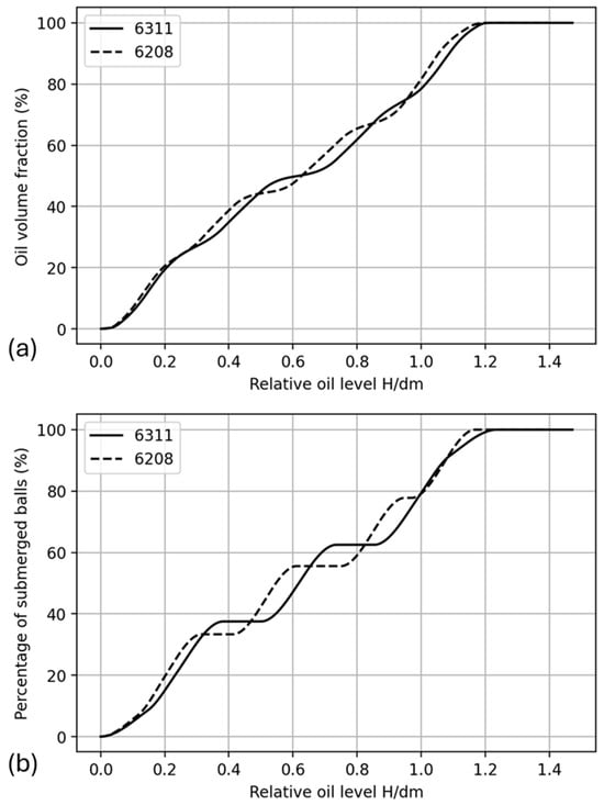 Evolution of (a) bath volume in the bearing and (b) number of submerged balls depending on the relative oil level.
