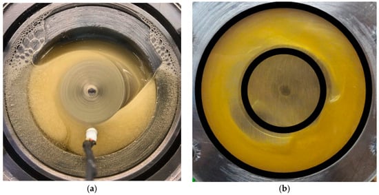 In the context of oil bath lubrication, Peterson et al. demonstrated that when the oil level is high, an oil ring is formed []. Hannon et al. presented results related to the quantity of oil in an oil-bath-lubricated bearing, showing a phenomenon of oil aspiration into the bearing and the beginning of ring formation, although these tests were conducted at low speeds []. This phenomenon of oil ring formation has also been observed in splash-lubricated epicyclic gear trains []. This particular flow pattern within the bearing when an oil bath is employed must have an impact on the churning power losses, and this raises the question of the suitability of existing models for correctly predicting these losses.