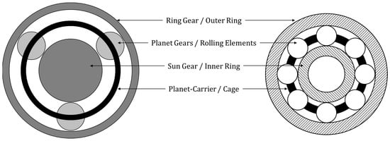 Analogy between an epicyclic gear train (left) and a bearing (right).
