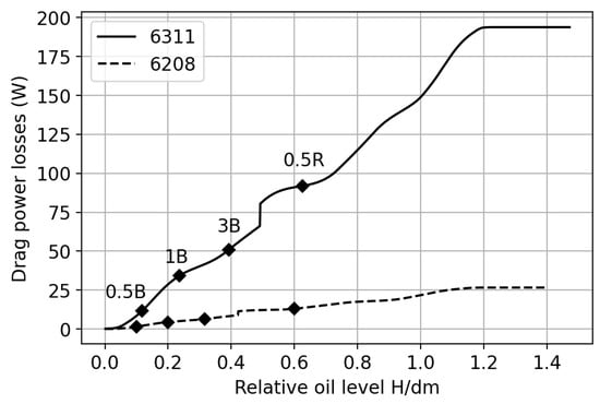 An example of drag loss calculation for the 6311 and 6208 DGBB s (at 6400 rpm with oil at 50 °C) depending on the relative oil level is given in Figure 13. The marks on the curves correspond to immersions 0.5 B, 1 B, 3 B, and 0.5 R. The transition from an air–oil mixture to an oil ring is visible, since a sudden increase in power losses occurs for a relative level equal to 0.491 and 0.422, respectively, for the 6311 and 6208 bearings. This value corresponds to an immersion greater than three submerged balls for the two tested bearings. The oil quantity can, however, vary without modifying the number of balls in the bath over a small level range; the plateau is visible in Figure 10b. The model result coincides with the experimental observations: an oil ring forms when the bearing is half-immersed.