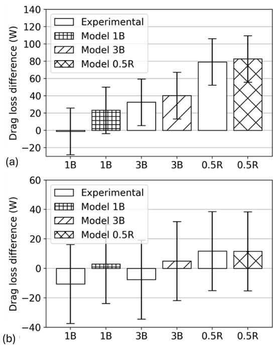 It is possible to experimentally isolate the drag power losses due to the increase in oil level by subtracting the power losses obtained for large heights from the power losses of the tests with a half-submerged ball []. Thus, the difference in drag losses is measurable. Figure 14 shows the difference in the measured drag losses at 6400 rpm compared to those calculated by the developed drag model. The drag power losses predicted by the model are consistent with the experimentally estimated values. Negative values were found for the 6208 bearing, which can be explained by the very low orders of magnitude of the power losses and the high uncertainty. The absolute error of the power losses calculated by the model compared to the experimental power losses is less than the measurement uncertainty (26.8 W) for each oil level.