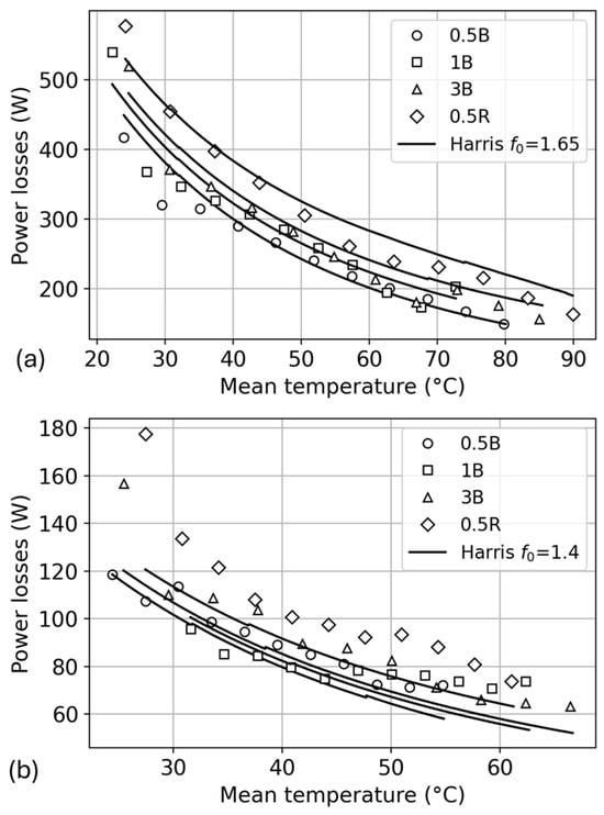Only a low oil bath level was previously considered. Then, tests with different oil levels were conducted. As mentioned previously, the oil bath level is relative to the number of submerged rolling elements, ranging from a half-submerged ball (industry recommendation) to a half-submerged DGBB. DGBBs 6311 and 6208 were tested at 6400 rpm and for each immersion level. One mainly notices at first that the larger bearing (i.e., 6311) leads to higher power losses considering identical mean temperature, which was probably due to the bigger size of the rolling elements. The losses increase with the oil level in the DGBB (Figure 7 and Figure 8). Moving from a half-submerged ball to a fully submerged ball and then to three submerged balls corresponds to an increase in power losses of 7.5% and between 11% and 20%, respectively, for both DGBBs. When half of the bearing is submerged, the losses increase between 24% and 36%.