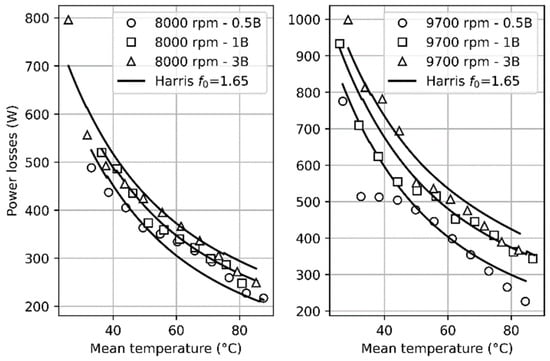 Since the local model and the Harris model give very close results once the parameter is experimentally adjusted [], only the Harris model is presented here, to which the previously presented drag power loss model is added. The values for DGBBs 6311 and 6208 are, respectively, 1.65 and 1.40. The results of this model were compared to the measurements made during tests on the 6311 and 6208 bearings for several oil levels. The addition of drag in the Harris model allows the oil level to be considered in the power loss calculation (Figure 15). Moreover, one clearly observes that the curves obtained at different oil levels remain parallel when the mean temperature increases, highlighting the poor influence of the viscosity on the added drag loss. The relative error is less than 7.5% for the 6311 DGBB and less than 11.5% for the 6208 bearing for less than three submerged balls, and 16.2% for half of the submerged 6208 DGBB. The results from the model were also compared with the measured power losses of the 6311 DGBB at two different rotating speeds (8000 rpm and 9700 rpm) and various oil levels (Figure 16). These results are still in good agreement with the experiments, with the mean relative error equal to 6.9%. When the rotation speed and the oil level equal 9700 rpm and 0.5 B, respectively (Figure 16), one notices a considerable decrease in the power losses with the mean temperature followed by 500 W constant value from 20 °C to 45 °C, which was not observed for the other curves. Since the oil level is low, it is not due to the drag power. Therefore, this behaviour might be connected to hydrodynamic effects in the contact. However, it has been demonstrated in previous investigations [] that the contact temperature has a significant role in the lubrication regime. Therefore, the mean temperature cannot be used here to consider this fact.