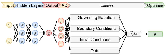 Following the work of Hornik and Cybenko, who derived that deep NNs can approximate any continuous function to a certain level of accuracy [24,25], Hyuk extended this theory to include Borel measurable functions [26]. The early contributions to physics-based regularization in NNs were made by [26,27]. Although Lagaris and Hyuk did not explicitly utilize the term “physics-informed”, their research closely reflects the core concepts of what is now recognized as PINNs. Hyuk’s key innovation was to modify the NN’s loss function to integrate the governing differential equation, laying the groundwork for developing PINNs. This concept of embedding physical laws into NN training has significantly influenced the evolution of PIML, which combines traditional machine learning with domain-specific knowledge. Due to the limited computational resources and the early state of computational algebra techniques, this approach did not gain widespread attention. Recent progress in gradient calculation methods (e.g., AD) and significant improvements in hardware processing power opened up new potential.