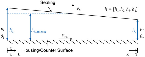 Since the counter surface moves to the right, lubricant is impounded to the left of the seal. To its right, the film height decreases, creating a region of cavitation. The presented film height at a position x is the sum of all lubricated fractions at that position. It is assumed for modeling that at each position with , half of the lubricant sticks on the seal (top) and the other half on the counter surface (bottom). The plots do not contain any information on what part of the lubricant sticks on the bottom or top of the seal.