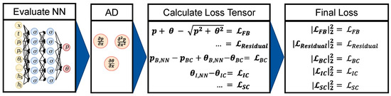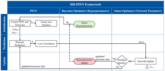 Bayesian optimization is used to find adequate hyperparameters (hps). This probabilistic finding of coherence between multiple unknown parameters returns a starting point for further optimization. An overview is shown in Figure 6. Multiple training trials run in an outer loop until promising hps are found. For each training trial, a PINN and the corresponding loss functions are initialized. In the inner loop, predictions of p and are evaluated with the current neurons’ weights and biases for a predefined number of epochs. Consequently, the five losses are calculated. Adam optimizer then updates all neurons. Once all epochs are finished, a new trial is started. After finding promising hps, these can be further fine-tuned manually or a longer training session can be started to train a final NN. Training runs are executed on a stand-alone Dell computer with the following specifications: Intel I9 13th-generation processor, 128 GB RAM DDR5, and Nvidia RXT 4090.