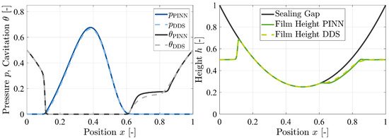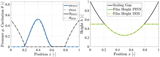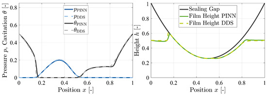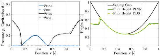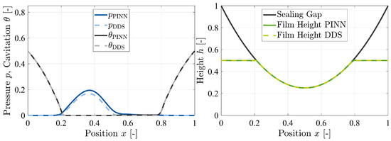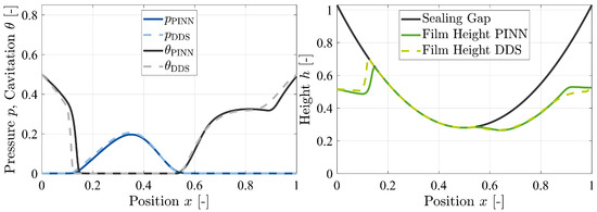 The prediction of the PINN framework is compared to the rigid DDS. This model does not incorporate the Abaqus integration and thus neglects deformation, friction, and contact mechanics, focusing exclusively on lubrication dynamics. Both PINN and rigid DDS solve the same underlying equations, allowing for direct validation of the PINN’s predicted outputs. Cavitation in the fluid film is modeled according to the Jakobsson–Floberg–Olsson cavitation model. This model assumes the gaseous phase formation due to vaporization or the air dissolution in the fluid if the local pressure drops below a certain threshold (in this study ). Cavitation is characterized by the cavity fraction [3], which represents the local gaseous volume fraction, ranging from 0 (no cavitation) to 1 (full cavitation).