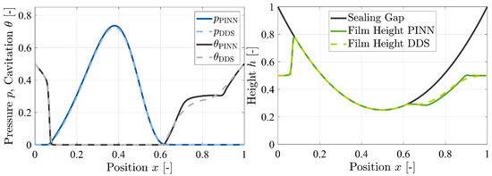 This work considers two geometries, which do not consider a bend in the gap; thus, the parameter is set to zero. At the film height is at all positions where the gap height is higher than . For all positions with smaller gap heights, the film height and gap height are equal (i.e., ). The boundary condition is 0 for the pressure and for the cavity fraction at both boundaries. In both cases, a curved sealing geometry is investigated by setting the parameter to 3. For the first test case, the sealing (upper part of the gap) is kept stationary, with only the counter surface (lower part) moving horizontally. For the second test case, the curved sealing is additionally moved vertically from the counter surface to model an inverse squeezing motion. Table 2 gives an overview of the test cases. To make an evaluation with the DDS possible, a test case with insufficient lubrication, meaning that the seal is only partly lubricated, is chosen. Hydrodynamic and surface parameters like and are set to one since they get normalized internally. Shear and pressure flow factors are neglected with and ; therefore, no roughness is considered regarding the surfaces.