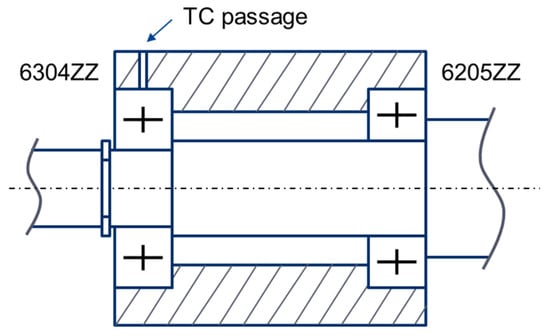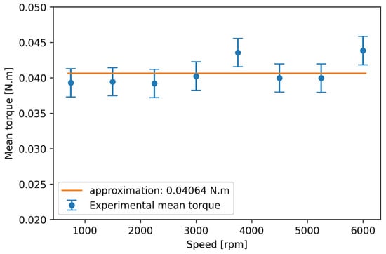 The torque is measured at speeds from 750 rpm to 6000 rpm in 750 rpm increments and is finally averaged over one minute for each speed. It can be observed that the torque remains nearly constant at approximately N·m whatever the speed value may be (Figure 4). This is mainly due to both the weak windage loss induced by the small-sized shaft (i.e., 16 mm in diameter and 30 mm in length) and the weak load-independent loss inside the bearings.