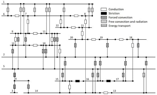 The losses cannot be easily separated, therefore Durand de Gevigney’s [16] approach is used to identify each source of losses. This method employs the thermal network technique, which enables the numerical reproduction of the thermal behavior of a system. This is achieved by dividing the system into isothermal elements, which are listed in Table 5 and presented on Figure 5. Table 5 also indicates the locations of the thermocouples on the test bench.