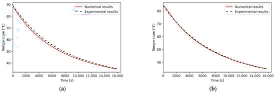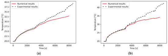 Comparison between experimental and numerical temperatures for Hypothesis 1 () for: (a) the planet carrier (node 14); (b) the 61919 bearing inner ring (node 15).