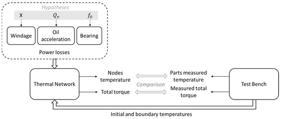 Three parameters found in the power loss formulations are thus challenging to determine: the oil volume fraction, ; the accelerated oil flow rate, ; and the bearing loss factor, . Therefore, their values will be adjusted using the thermal network. The principle followed is presented in Figure 9. Hypotheses are made on the values of these three parameters, and the power losses computed with these parameters are injected inside the thermal network. Since the thermal network heat exchanges have previously been validated, the losses are the only unknowns. The initial temperature of each node and the boundary temperatures, i.e., the ambient air and the oil inlet temperatures are also input data for the thermal network. If the temperature evolutions and the total torque obtained numerically are the same as the ones found experimentally, then the values of , , and are validated and the power loss distribution inside the gearbox is therefore found.