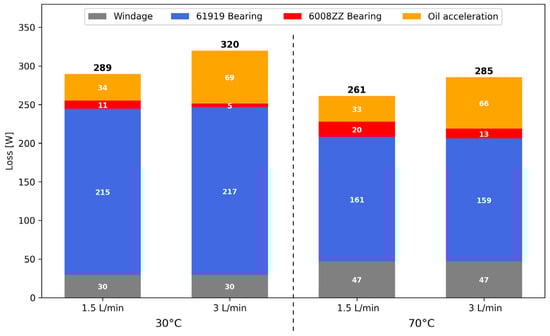 To fully see the impact of operating conditions on the loss distribution, a stacked diagram showing the different power losses at 4500 rpm for the different oil flow rates and temperatures is presented in Figure 14. The 61919 bearing losses represent the biggest part of the power losses, and they decrease with the increase of the oil temperature. As shown previously, windage losses are larger when the oil temperature is 70 °C. The oil acceleration losses are an important part of the power losses, particularly when 3 L/min is injected in the system. Regarding the 6008ZZ bearing, its losses increase with the oil temperature. This increase can probably be attributed to the losses due to the expansion of the steel labyrinth seal next to the bearing.