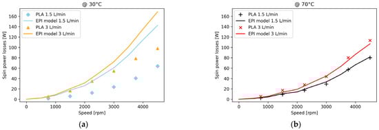 Figure 15 shows the power losses for the two configurations when the injected oil temperature equals 30 °C (Figure 15a) and 70 °C (Figure 15b). One notices that the oil temperature does not have an influence on the spin power losses for the PLA configuration, whereas it does for EPI configuration. Indeed, in this case, the higher the temperature, the lower the spin power losses. Moreover, at 30 °C the spin power losses for the EPI configuration are higher than the one found here for the PLA configuration, while at 70 °C the power losses are almost the same.