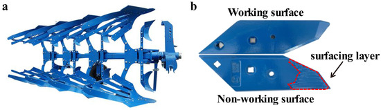 In this paper, the plough tip used is adapted to the LK500 high-speed hydraulic turning plough (Ryken Agricultural Machinery (Qingdao) Co., Ltd., Qingdao, China), which has a wide range of uses in the southern Xinjiang region, as shown in Figure 1a. The plough tip material is 30MnB5 steel, which is pressed and moulded. It was quenched at 850 °C using cold oil and then tempered at 500 °C using cold oil. The surface hardness was brought to 442.37 HV. To increase the wear resistance, a surfacing layer was added to the non-working side of the plough tip to form the first type of self-sharpening, as shown in Figure 1b. The proportions of the main elements and the important mechanical properties of the plough tips are shown in Table 1 and Table 2.