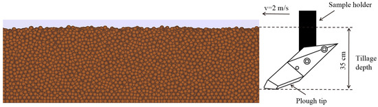 Discrete-element simulation tests require the setting of simulation parameters between soil and soil and between soil and materials in contact with the soil. Combined with relevant data from Lei [31], the main parameters used for the simulation tests are shown in Table 4. Since soil is a complex inhomogeneous material, the reliability of the simulation results depends on the choice of eigenrelationships. The Hertz–Mindlin theory with the JKR contact model was selected for DEM simulations. In order to reduce the computing power of the computer while ensuring a realistic simulation of the tillage process of the high-speed plough as well as the accuracy of the calculations, the radius of the soil particles was set to be 5 mm, and a soil model with a size of 1.8 (L) × 1.2 (W) × 0.5 (H) m3 was established. To match the speed of the wear test, the simulated running speed was 2 m/s, as shown in Figure 2.
