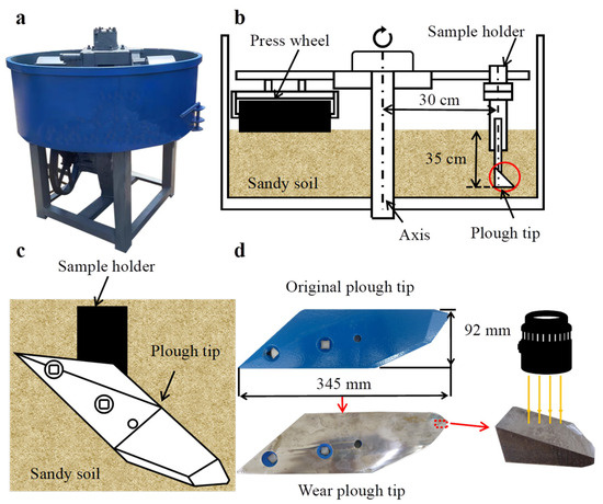 South Xinjiang is an important crop production area in China, belonging to the oasis agriculture type [1,2,3]; the main crops grown are cotton, maize and wheat [4,5]. However, the high saline content of the soil, sandy soil and soil sloughing have a greater impact on the absorption of water and fertilisers in the soil by plants [6,7,8]. Tillage is the primary process in agricultural planting activities, which can increase the interaction between soil and air, improve water storage capacity, break the phenomenon of soil crusting, provide a good growing environment for crops, and promote the sustainable development of agriculture [9,10,11]. High-speed plough tips are the core component in deep tillage operation in Xinjiang’s large fields, but the plough tip faces friction wear and impact during tillage, bringing about plough body loss, reduced working efficiency and increased energy consumption, which result in a large number of economic losses. With the rapid development of agriculture, the friction performance of the plough tip components has put forward higher requirements, and the examination of its wear resistance in soil is a necessary part of the optimisation of plough tip design and material selection [12].