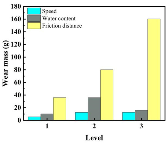 As speed increases, there is a smaller effect on the wear amount of the plough tip, which shows a slight upward trend. The wear of the plough tips at 20 r/min and 30 r/min was 5.56 g and 12.71 g. As soil water content increases, it has a greater effect on the wear of the plough tips, with a second-order parabolic pattern of increasing and then decreasing wear. The plough tip wear at 14% water content was 35.89 g. As the friction distance increases, it has the greatest effect on the wear of the plough tip, which shows a clear upward trend. The plough tip wear at 113 and 339 km was 35.89 and 160.32 g, respectively. The effect on plough tip wear follows the pattern friction distance > soil water content > rotational speed, as shown in Figure 4.