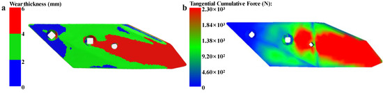A three-dimensional grid model of the original and 339 km worn plough tips was fitted to calculate the deviation value for the touchdown surface of the plough tip. The deviation values were set to 0–2 mm (blue), 2–4 mm (green) and 4–6 mm (red), as shown in Figure 5a. The results of the DEM simulation used to simulate the compressive stress distribution on the plough tip surface during ploughing are shown in Figure 5b. As can be seen in Figure 5a, the heavily worn area (red) occupies the tip of the touchdown surface and extends inwards. As the plough tip stands obliquely in the soil, the soil firmness when in contact with the soil decreases from the tip to the end of the plough. The red area represents where the tip is in contact with soil of higher solidity, where the tip of the tillage has a cutting and squeezing effect on the soil and the stress is most concentrated, as shown in Figure 5b. The light areas of wear (blue, green) are concentrated at the rear end of the plough tip and at the edge positions, which are in contact with less firm soil with less interaction force with the soil; therefore, the wear is lighter. Overall, the most tip wear occurs during tillage due to compression by the soil, resulting in higher surface compressive stresses. Variations in part thickness were also demonstrated in studies by Cucinotta and Natsis [33,34].