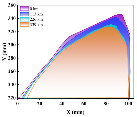 The plough tip wear is concentrated in the tip portion, and a plough tip projection contour variation diagram is obtained, as shown in Figure 6. In the figure, the purple contour is the original contour, the edge of the cutting edge is smooth and flat and the cutting-edge joint is sharp and angular. When the friction distance is changed from 0 to 339 km, it can be seen that the projected area of the tip decreases, the cutting edge gradually becomes rugged due to material spalling and the corners of the cutting-edge joint become rounded. At the same time, the length and width of the tip also decrease.
