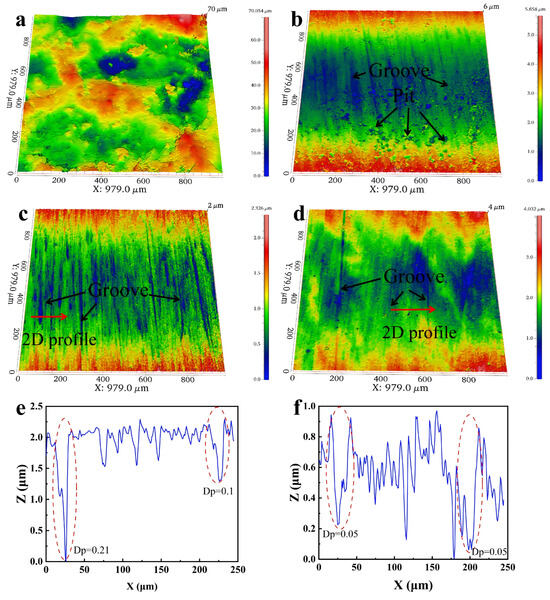 A three-dimensional morphology analysis of the wear surfaces of plough tip samples with the original morphology and friction distances of 113, 226 and 339 km simulated for different lengths of time at the same location is shown in Figure 7. Two-dimensional contour curves of part of the region of Figure 7c,d were obtained, as shown in Figure 7e,f. It can be seen from Figure 7a that the original surface caused by machining is high and low with no distinctive features, and the roughness (Sa) is 6.416 μm. It is possible to observe a large number of spalling pits as well as a large number of continuously intersecting plough grooves with a roughness (Sa) of 0.818 μm in Figure 7b. Under high-water-content conditions, soil particles tend to move randomly on the plough tip surface, creating randomly orientated groove scratches. The same phenomenon was observed in a study by Singh et al. [35]. Yao et al. [30] found that component wear can be reduced when the soil water content is high. It can be observed from Figure 7c that there are a large number of dense and inconsistent width furrows as well as a small number of spalling pits at the tip of the plough tip with a roughness (Sa) of 0.612 μm. It can be observed from Figure 7d that the number of surface spalling pits is reduced and their size decreases with a roughness (Sa) of 0.427 μm. Coronado [36] and Kalácska [25] verified by experimental comparisons that measuring the width and depth of the grooves calculates the Dp value, which informs about the microscopic wear mechanism of the surface. The Dp value of the plough groove was calculated by obtaining a 2D profile curve of the wear surface, as shown in Equation (1) [29]. For different depths and widths of grooves, when the Dp value is greater than 0.2, the wear mechanism is micro-cutting, and when the Dp value is less than 0.2, the wear mechanism is micro-ploughing. At 113, 226 and 339 km, the Dp values on the surface of the plough tip samples were less than 0.2, and the wear mechanism was micro-ploughing, as shown in Figure 7e,f. The sand soil used in the experiment has a small particle size; the wear surface roughness gradually decreases; and the soil has a polishing effect on the plough tip surface. Overall, as the friction distance increases, the machined bumps on the plough tip surface are gradually worn away, and sand particles are embedded into the contact surface, creating a plough groove effect, along with spalling pits caused by fatigue wear. Throughout the wear period, the plough groove effect is always accompanied, and the spalling pits appearing reciprocally.