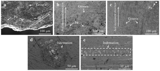 The wear surface of the plough tip sample with a friction distance of 339 km was observed in the extended soil sliding direction, as shown in Figure 8. It can be seen from Figure 8a that the plough tip edge profile becomes rough due to material loss caused by abrasion, while there are impact pits caused by interactions with soil particles on the edge surface as well as plough furrows, with a high percentage of impact pits, with impact wear dominating at the cutting edge. The extended soil sliding direction shows a decrease in the number of impact pits and a gradual change in furrow scratches, as shown in Figure 8b. Subsequently, the form of damage to the plough tip surface by the soil particles gradually changed to predominantly furrow scratches with a small number of spalling pits, as shown in Figure 8c. Similar results were found in studies by Kalácska and Bialobrzeska [25,37]. In addition to this, ring-shaped indentations formed on the metal surface after rotational crushing of the soil particles were observed, as shown in Figure 8d. Also, tooth marks were formed on the metal surface after rolling abrasion of soil particles, as shown in Figure 8e. Overall, in the soil movement direction, from the plough tip cutting edge to the plough tip surface interior, the form of damage changed from impact abrasion to plough furrow scratches.
