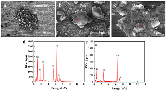 Corrosive wear and EDS analysis of (a) salt accumulation; (b) crystals; and (c) corrosion traces; (d) analysis of the composition of the crystals; (e) analysis of corrosion products.