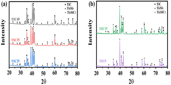 The X-ray diffraction (XRD) patterns of the elaborated TSC composites are shown in Figure 1. Except for the TSC0 (0 wt% TiC) composite, the Ti3SiC2, Ti5Si3, and TiC phases were all detected within the other TSC composites. As shown in Table 1, employing a mixture ratio of 3Ti:1SiC:1C led to the successful sintering of the TSC40 sample. The TiC content was lowered to 35 wt.% (TSC35 composite) by extending the soaking time from 20 to 40 min. This allowed additional time for the TiC and Ti5Si3 phases to react with each other, forming more of the Ti3SiC2 phase [17,20,21]. To further diminish the TiC content, an augmentation of the Si content within the reactive starting powders was applied (3Ti:1.2SiC:1C). As a result, TiC and Ti5Si3 were further consumed to form the Ti3SiC2 MAX phase, and the TSC25 composite was successfully manufactured.