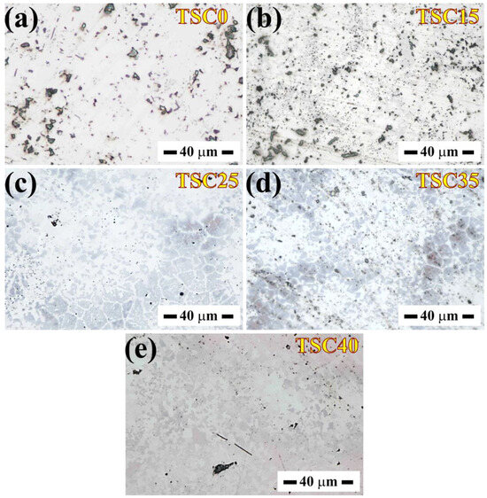 Previously [17], we also showed that with the Al addition, TiC could be lowered or eliminated, and TSC15 with TSC0 composites were successfully synthesized. In summary, the TiC content could be easily controlled by controlling the Si and Al contents. Optical micrographs of the polished TSC composites’ surfaces are shown in Figure 2. Since Ti3SiC2 and Ti5Si3 are isostructural, they are visually indistinguishable with an optical microscope. The optical contrast of the Ti3SiC2 and Ti5Si3 phases is nearly the same, which appears as a bright contrast. This indicates that no TiC phase is present in the sample, while the dark regions correspond to pores within the material. With an increase in TiC content, the emergence and expansion of grey-colored phase clusters were observed, which evolved as the composition transitioned from TSC15 to the TSC40 composite.