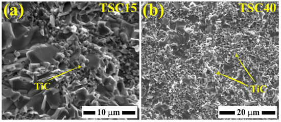 The scanning electron microscope (SEM) images of the fractured surfaces of the TSC15 and TSC40 composites are shown in Figure 3a and Figure 3b, respectively. The fractured surface of TSC15 is readily distinguishable by flat steps or facets (Figure 3a), a characteristic of cleavage fracture for both the Ti3SiC2 and Ti5Si3 phases [33,34]. EDS analysis revealed those grains to be composed of 53 at. % Ti, 17 at. % of Si, and 30 at. % of C, which is a composition near to that of the MAX phase Ti3SiC2. Nearby, the TiC grains are small and equiaxed, exhibiting a transgranular fracture mode [35]. The TSC40 composite’s fractured surface is marked by a high amount of equiaxed grains, which is expected, since the TiC content is relatively higher (40 wt.%) in this composite (Figure 3b). Note that the carbon signal in EDS might not be entirely reliable; these equiaxed grains are composed mainly of Ti and C (62 at. % Ti, 2 at. % Si, and 36 at. % C).