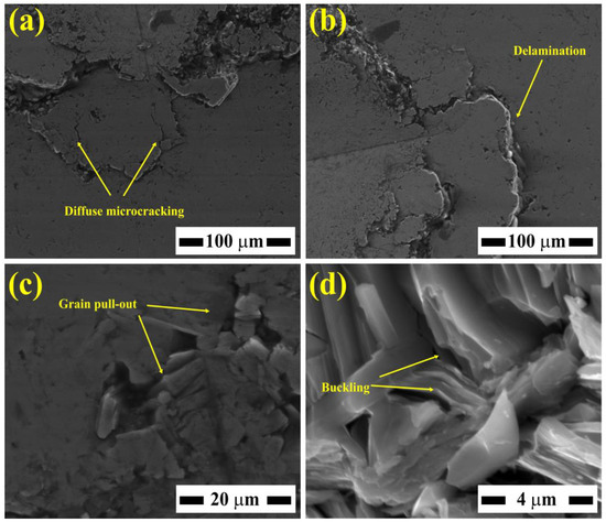SEM images depicting the damage mechanisms observed after the indentation tests are shown in Figure 4. It is well documented that the indentation marks in Ti3SiC2 are asymmetric and extend beyond the indentation mark, characterized by the absence of cracks at their corners with different damage mechanisms. Herein, four mechanisms were well identified: (1) delamination, (2) diffuse microcracking (Figure 4b), (3) grain pull-out (Figure 4c), and (4) grain buckling (Figure 4d). These mechanisms dissipate mechanical energy and are responsible for the heightened toughness observed in MAX phases [3,38].