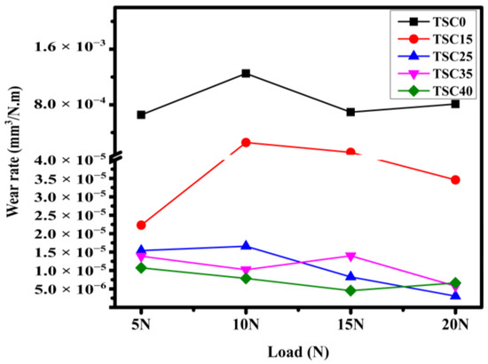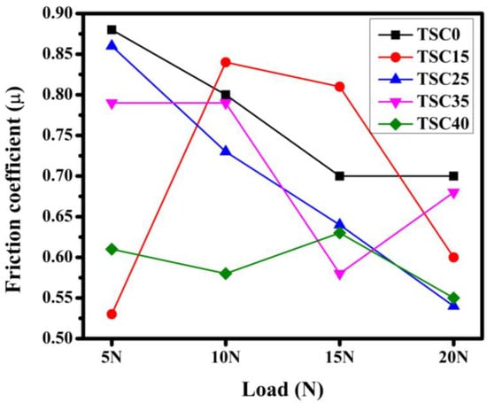 The average values of the friction coefficient are shown in Figure 5. Overall, the TSC0 composite exhibited the highest values under all applied loads [0.7, 0.9], as shown in Table 2. On the contrary, the lowest friction coefficient values were recorded for the TSC40 composite [0.55, 0.61]. However, the TSC25 composite showed a high value at 5 N (0.86), which then decreased progressively with increasing load, ultimately reaching the lowest recorded value (0.54) at a 20 N load.
