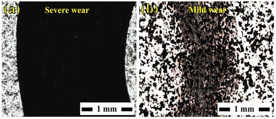 Interestingly, for the TiC-containing composites, the wear rate decreased as the applied load increased (Figure 6 and Table 2). Following Archard’s rule, material loss is proportional to the applied load. Conversely, the TSC composites sliding against steel did not conform to this rule. Notably, this was more prominent for the TSC15 composite. The specific wear rate initially increased from 2.3 × 10−5 mm3/N·m under 5 N to 3 × 10−4 mm3/N·m at 10 N, which corresponds to the transition from a mild- to a severe-wear regime. Upon further increase in the applied load up to 15 N, the specific wear rate slightly decreased, followed by a more significant reduction to 3.5 × 10−5 mm3/N·m under a 20 N load. In the case of the composites reinforced with 25, 35, and 40 wt.% TiC, the specific wear rate decreased as the applied load increased to attain values lower than two orders of magnitude than those of the 0 wt.% TiC composite (Table 2). The lowest recorded specific wear rate value was 3 × 10−6 mm3/N·m for the TSC25 composite under a load of 20 N. To sum up, within the same wear regime, for the TiC-containing composites, the specific wear rate decreases when the applied load is higher. The authors suspect that this was because of the adhesive wear of the steel counterpart discussed in the next paragraphs, meaning the higher the load, the more steel is deposited on the worn surfaces, replacing the material lost. Panoramic views of the wear tracks on TSC composites show the difference between the mild- and severe-wear regimes (Figure 7).