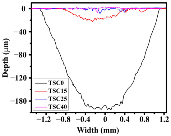 In the mild-wear regime, a discernible tribofilm was evident, accompanied by some signs of abrasion. On the other hand, the severe-wear regime, characteristic of low- or no-TiC reinforcement, showed a comparatively chasmic wear track’s width. To further highlight the role of TiC in enhancing the wear resistance of the TSC composites, 2D profiles were obtained of the worn surfaces, as shown in Figure 8. The depth of the worn surface for the 0 wt% TiC composite (TSC0) was 180 μm, whereas it reached a depth as low as 5 to 20 μm in the case of the TiC-containing composite. These 2D profiles showed the remarkable improvement in wear resistance exhibited by these composites.