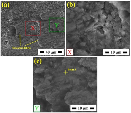 SEM (SE mode) images of of: (a) Worn surface of TSC0 under 5 N load, (b) SE image of the area marked as “X” in (a), (c) SE image of the area marked as “Y” in (a).