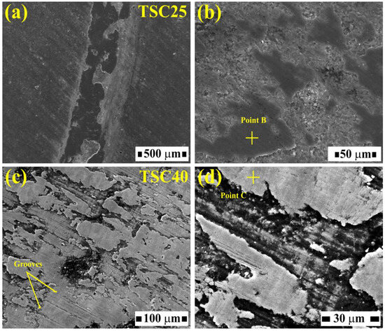 SEM (SE mode) of the (a,b) TSC25 and (c,d) TSC40 worn surfaces under 5 N load.