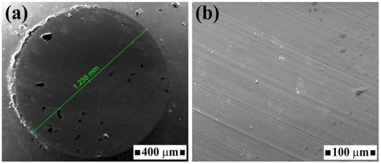 The wear mechanism of the TiC-reinforced composites under the mild-wear stage showed the deposition of a ferrous layer. In dry sliding of the ceramic materials against the steel counterfaces, the dominant wear generally was identified as tribo-oxidation on the ceramic surface and a combination of severe adhesive and/or abrasive wear on the steel ball [40]. SEM images of the wear scar of the steel ball are shown in Figure 11. The wear scar was circular with signs of abrasive grooves on the steel ball. This confirmed substantial material transfer from the ball to the TSC composite counterface.
