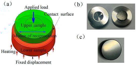 Schematic diagram of friction test and test samples: (a) friction test and sliding directions; (b) stainless steel sample (left side—top view; right side—bottom view); (c) graphite sample.