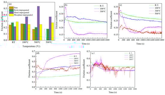 Figure 2b to Figure 2e, respectively, show the changes in the friction coefficients of four graphite materials with test time at different temperatures. For the pure graphite materials and resin–graphite, the friction coefficients are relatively stable or have a slight decreasing trend with an increase in test time at R.T. and 100 °C. A significant decline in the friction coefficient is observed during the early part of the test at 300 °C, and then the friction coefficient has a minor increase and keeps stable. As can be seen from Figure 2d, for the metal-impregnated graphite materials, the friction coefficients increase with the test time at R.T., 100 °C, and especially 300 °C. For the graphite material impregnated with phosphate, the friction coefficients remain stable after the initial running-in stage at no more than 300 °C. At 500 °C, the friction coefficients of these three impregnated graphite materials fluctuate sharply.