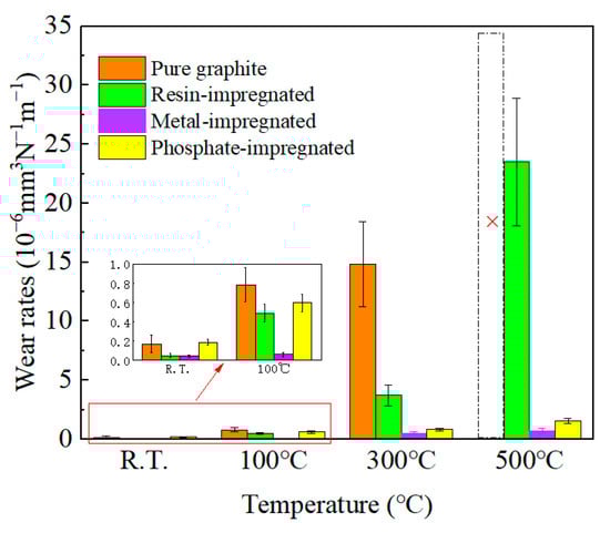 The wear rates of the four graphite materials at different temperatures. (“×” indicates that the group did not undergo a friction test for safety reasons).
